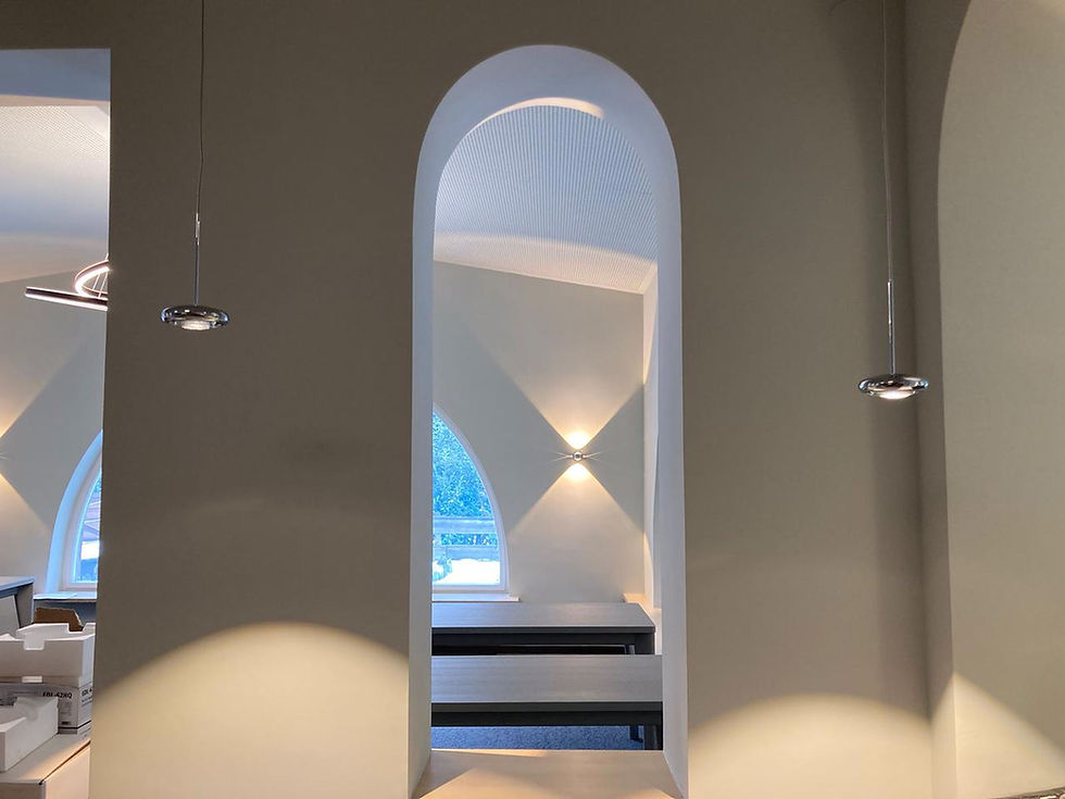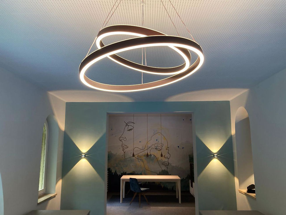 Für die Allgäuer Werkstätten durften wir den Eingangsbereich neu beleuchten. Die gewählte Leuchte hat eine besondere Symbolik: Sie kommt von zwei Seiten und vereint sich in der Mitte zu einer geschwungenen Form - ein Sinnbild für Verbindung und Gemeinschaft. So entstand ein einladendes Lichtbild, das Funktionalität und Bedeutung harmonisch vereint.